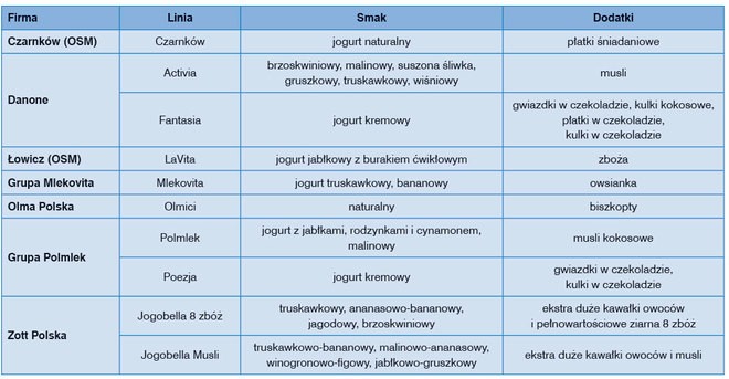 Spośród polskich producentów najbardziej rozwinięte portfolio ma Bakoma. W jej ofercie znajdziemy owocowe jogurty pod markami 7 zbóż, 7 zbóż musli oraz jogurty 7 zbóż Men. Grupa Mlekovita w swoim portfolio śniadaniowym posiada jogurty truskawkowe i bananowe z owsianką. Bardzo ciekawą linię w ostatnim roku zaproponowała mleczarnia Łowicz (OSM). W jej portfolio znajdziemy linię LaVita, a wśród niej jogurt jabłkowy z burakiem ćwikłowym i zbożami, Jogurt LaVita marchwiowo-pomarańczowy ze zbożami oraz jogurt LaVita wieloowocowy ze zbożami, w butelkach 400 g.