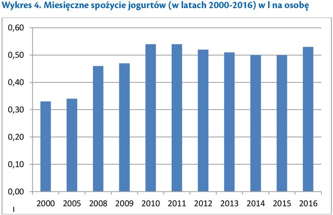 Spożycie jogurtów w Polsce po osiągnięciu w 2010 r. ponad 0,5 l na osobę miesięcznie utrzymuje się na względnie stałym poziomie. Na początku XXI w. miesięczne spożycie jogurtów wynosiło nieco ponad 0,3 l na osobę. Jogurty oraz inne produkty fermentowane, głównie te prozdrowotne nadal powinny cieszyć się dużym uznaniem wśród konsumentów. Jogurty szczególnym zainteresowaniem cieszą się wśród dzieci, a więc stosowanie rodzinnych opakowań jest tu jak najbardziej pożądane.