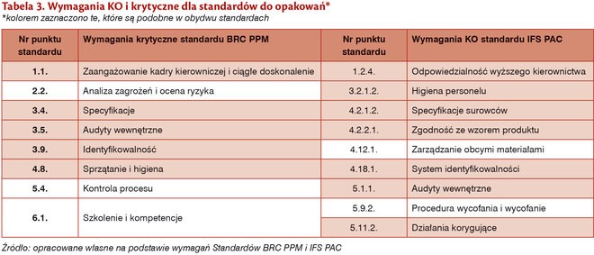 Wymagania standardów odnośnie do opakowań są różnorodne i podzielone na kilka rozdziałów. Opis skrócony tych wymagań pokazano w tabeli 2.