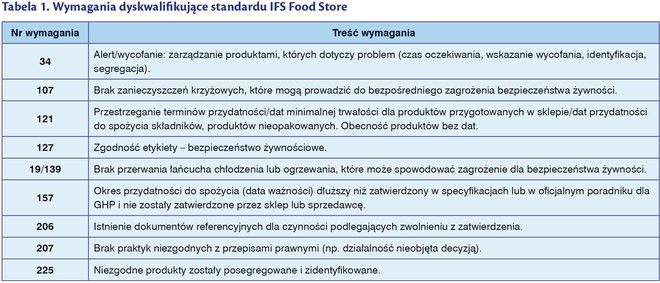 Inny rodzaj standardów dla dystrybutorów to standard dla sklepów. Opracowane zostały takie standardy w „rodzinie” standardów BRC (Retail) oraz w IFS (Food Store FS). Wymagania kontrolują działania w zakresie bezpieczeństwa żywności w sklepach detalicznych. Wszystkie działania z zakresu detalicznej sprzedaży żywności są oceniane niezależnie od tego, czy są one zarządzane bezpośrednio przez właściciela sklepu, czy też przez podwykonawcę (np. franczyzobiorcę). Standardy te oceniają zarządzanie sklepem i przez to zapewnienie bezpieczeństwa i jakości żywności. Standard BRC Retail ma spis wymagań, podzielony na rozdziały podobnie jak to jest w standardzie BRC Food. Natomiast IFS Food Store wymagania ma dedykowane poszczególnym stoiskom w sklepie, w tym nabiałowemu oraz ogólnym wymaganiom dotyczącym zarządzania sklepem. W standardzie tym znajdują się też wymagania dyskwalifikujące tzw. Knocking-out (KO). Pokazano je w tabeli 1.