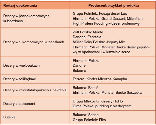 Opakowania w kategorii deserów stanowią jeden z istotniejszych elementów strategii marketingowej dla tych produktów. Już na pierwszy rzut oka daje się zauważyć, że opakowania deserów kuszą wymyślną i urzekającą oczy i zmysły stylistyką i wpisują się w najnowsze rozwiązania technologiczne. W zależności od inwencji producenta mogą być matowe (Bakoma, Ehrmann Polska High Protein Pudding, Grupa Polmlek, Zott Polska), półprzezroczyste lub przezroczyste, co pozwala dodatkowo zaprezentować atrakcyjną strukturę wewnętrzną deseru, co może być pomocne w ich sprzedaży (Zott Polska, Ehrmann Polska, Grupa Polmlek, Bakoma). Opakowania mogą być 1- lub wielokomorowe. Zazwyczaj w jednym pojemniczku znajduje się deser, w drugim stosownie dopasowany do niego dodatek. Klient sam może sobie taki dodatek (pulpy owoce, sosy, drażetki, ciasteczka lub musli) dozować według uznania (Danone Fantazja, Müller Mix, Ehrmann Monster Backe). Desery bardzo często sprzedawane są też w wielopakach: o jednym smaku (4, 6 lub 8 kubeczków) lub w różnych kombinacjach smakowych. Tego typu rozwiązanie daje szerszy wybór dla konsumentów, którzy mogą kupić produkt w niższej cenie za opakowanie jednostkowe.