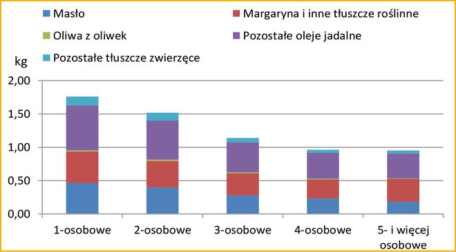 Obserwuje się dysproporcje w spożyciu tłuszczów, w zależności od typu gospodarstwa domowego. Ze względu na liczbę osób w gospodarstwie domowym największe spożycie cechuje jednoosobowe gospodarstwa domowe, w których miesięczna konsumpcja tłuszczów wynosi blisko 1,8 kg na osobę. W miarę wzrostu wielkości gospodarstwa domowego miesięczne spożycie tłuszczów ulega zmniejszeniu, osiągając niemal kilogram na osobę w gospodarstwach domowych składających się z czterech i większej liczby osób.