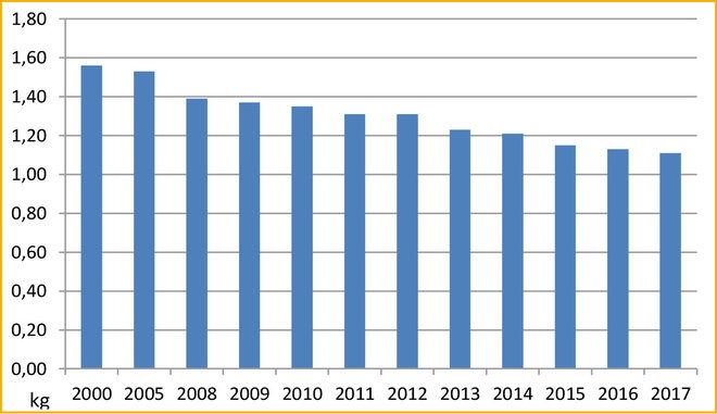 Wykres 1. Miesięczne spożycie tłuszczów w polskich gospodarstwach domowych, w latach 2000-2017 (w kg/osobę)