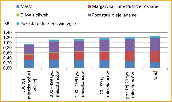 Spożycie tłuszczów zróżnicowane jest także ze względu na miejsce zamieszkania. I tak, w gospodarstwach domowych zlokalizowanych w największych miastach (500 tys. mieszkańców i więcej) konsumpcja ta kształtuje się na poziomie około 1 kg na osobę, a w wiejskich gospodarstwach – blisko 1,3 kg na osobę.