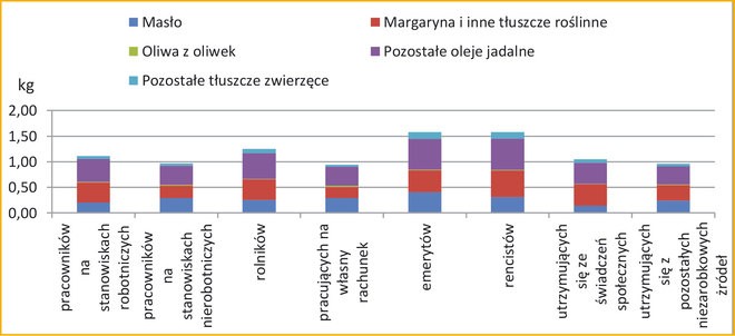 Zauważa się także, że im wyższym poziomem wykształcenia legitymują się konsumenci, tym mniej spożywają tłuszczów. W gospodarstwach domowych prowadzonych przez osoby posiadające wyższe wykształcenie miesięczne spożycie tłuszczów stanowiło około 1 kg/osobę, podczas gdy w gospodarstwach domowych osób z wyższym wykształceniem 1,4 kg/osobę.