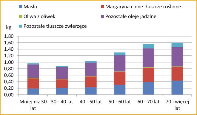 Na spożycie tłuszczów wpływ wywiera także wiek osób. Więcej tłuszczów spożywają osoby starsze, po 60. roku życia. Miesięczna konsumpcja tłuszczów w gospodarstwach domowych prowadzonych przez osoby w wieku 60 lat i więcej, w gospodarstwach emerytów i rencistów wynosi 1,6 kg na osobę. W gospodarstwach domowych prowadzonych przez osoby młodsze, w szczególności w wieku 30-40 lat spożycie tłuszczów jest mniejsze i wynosi około 0,9 kg na osobę. Osoby piastujące stanowiska nierobotnicze oraz osoby prowadzące własny biznes spożywają mniej tłuszczów niż te z pozostałych grup społeczno-ekonomicznych.