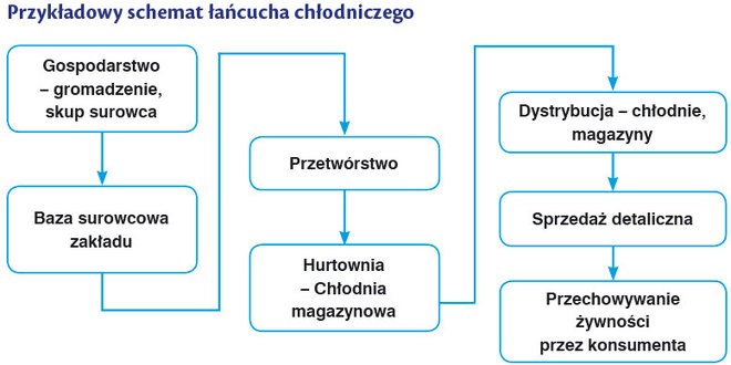W chłodnictwie produktów spożywczych funkcjonuje cały zespół powiązanych ze sobą czynności, które muszą zostać wykonane w celu dostarczenia konsumentowi produktu o odpowiedniej jakości. Czynności te tworzą tak zwany łańcuch chłodniczy. Łańcuch chłodniczy ma swój początek już w momencie pozyskania surowca przeznaczonego do późniejszego przerobu, magazynowania, dystrybucji i konsumpcji. Transport chłodniczy łączy ze sobą ogniwa systemu chłodniczego, tj. chłodnie produkcyjne, dystrybucyjne, punkty sprzedaży detalicznej, lodówki domowe. W łańcuchu chłodniczym od początku do końca powinny być zachowane odpowiednio dobrane warunki chłodnicze. Parametrem decydującym są zakresy niskich wartości temperatury. Ponadto produkt powinien być chroniony na każdym etapie, nie tylko przed zakażeniem drobnoustrojami, ale także przed zmianami smakowo-zapachowymi wynikłymi z niewłaściwego przechowywania. Zbagatelizowanie wymagań łańcucha chłodniczego może skutkować drastycznym spadkiem jakości mleka i jego przetworów, a także znacznym skróceniem terminu przydatności. Jedno ze spostrzeżeń w teorii współzależności czasu i temperatury przechowywania głosi, że w całym okresie składowania wpływ czasu składowania i wpływ temperatury kumulują się, przy czym jakość produktu przechowywanego w zmiennej temperaturze zależy od średniej temperatury cyklu składowania.