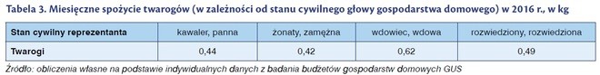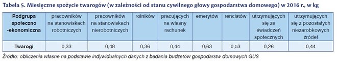 Stan cywilny to kolejna zmienna istotnie statystycznie różnicująca spożycie twarogów. Najwyższe spożycie serów twarogowych zaobserwowano w gospodarstwach wdów i wdowców – miesięcznie 0,62 kg na osobę, a najniższe w gospodarstwach osób będących w związkach – 0,42 kg na osobę. Zauważono też, że w gospodarstwach prowadzonych przez kobiety spożywano więcej twarogów (0,52 kg na osobę) niż w gospodarstwach, w których głową domu był mężczyzna (0,42 kg na osobę). Niskie spożycie twarogów w gospodarstwach osób w wieku 30-40 lat oraz w związkach małżeńskich/partnerskich może wynikać z częstszej obecności w tych gospodarstwach dzieci, które mają mniejsze potrzeby ilościowe spożywanej żywności.