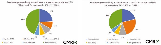 Sprzedaż kategorii serów twarogowych w sklepach małoformatowych do 300 m2 raportowana przez CMR w roku 2018 wzrosła w stosunku do roku 2017 (ok. 9% w wartości sprzedaży i ok. 5% w wolumenie sprzedaży). W kanale Supermarketów ta kategoria radziła sobie znacznie gorzej, wykazując zupełną stagnację w wolumenie i wartości sprzedaży (częściowy wpływ zakazu handlu w wybrane niedziele). W sklepach małoformatowych ser twarogowy znajdziemy w ok. 70% obiektów, na półce znajdują się średnio 4 różne produkty tej kategorii. W przypadku supermarketów sery twarogowe spotkamy w każdym sklepie należącym do tego formatu, a średnio w pojedynczej placówce konsument może wybierać spośród 16 różnych SKU. Najczęściej sery twarogowe występują w opakowaniach 250 g, udział w wartości sprzedaży tej gramatury w małych sklepach wynosi 60%, w sklepach dużych 65%. Drugim w rankingu popularności pod względem wagi jest duże opakowanie 1000 g, zazwyczaj kupowane jako baza do przygotowania wypieków i ciast (tzw. twaróg sernikowy, mielony), udziały w wartości sprzedaży wynoszą odpowiednio 8% i 13%. W obu analizowanych formatach piki sprzedażowe obserwowane są w piątki, w tym dniu odbywa się aż 20% wszystkich transakcji zakupu serów twarogowych. W sklepach małoformatowych do koszyka zazwyczaj trafia jedno opakowanie sera (84% transakcji), co ósmy kupujący sięga po dwa opakowania. W supermarketach jedno opakowanie kupowane jest w 80% transakcji, a dwa pojawiają się na co szóstym paragonie z zakupem serów twarogowych. Do koszyków z twarogami najczęściej trafiają mleko lub śmietany – występują na co czwartym paragonie z tą kategorią w supermarketach i na co piątym w sklepach mniejszych, również popularne są zakupy serów twarogowych z jogurtami, masłem, czy paczkowanym pieczywem. Za ok. 25% sprzedaży wartościowej serów twarogowych w sklepach małoformatowych do 300 m2 odpowiada jeden producent – firma Piątnica (OSM). Pozostali liczący się gracze rynkowi to Mlekpol (SM), Włoszczowa (OSM), Lacpol i Lactalis. Łącznie tych pięciu producentów odpowiada za ponad 55% rynku. W przypadku supermarketów liderem segmentu jest również firma Piątnica (OSM) z 18% udziałem w wartości sprzedaży, a kolejni istotni gracze rynkowi to Lactalis, Grupa Polmlek, Średzka SM. Warto odnotować wysoki udział sprzedaży serów twarogowych w supermarketach pod markami własnymi (private label). Sery pod brandem należącym do sieci lub dystrybutora można kupić w trzech supermarketach na cztery prowadzące sprzedaż tej kategorii. W 2018 roku tego typu produkty odpowiadały za prawie 24% udziału w wartości sprzedaży serów twarogowych (trend wzrostowy w stosunku do 2017 roku).