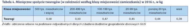 Spożycie twarogów uzależnione jest też od miejsca lokalizacji gospodarstwa domowego. Generalnie, im mniejsza miejscowość tym mniejsze spożycie twarogów. W gospodarstwach domowych zlokalizowanych w największych miastach (z 500 tys. mieszkańców i więcej) miesięczne spożycie twarogów kształtowało się na poziomie 0,58 kg, podczas gdy w wiejskich gospodarstwach domowych – 0,39 kg na osobę.