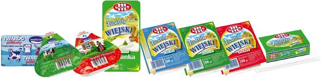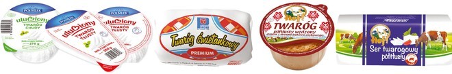 Grupa Mlekovita oferuje Twaróg Wiejski półtłusty w folii 500 g i 1 kg, twarogi Wiejskie półtłuste i tłuste w kostkach 200 g, twaróg śmietankowy ok. 300 g. Włoszczowa (OSM) proponuje twaróg półtłusty włoszczowski krajanka 400 g i 1 kg oraz w kostkach 250 g. Oferta twarogów mleczarni Czarnków (OSM) przedstawia się następująco: twaróg śmietankowy lub półtłusty w folii 200 g i 250 g, twaróg tłusty w folii 250 g oraz twaróg półtłusty klinek 250 g lub krajanka w pergaminie, a także twaróg Extra kulka. Wszystkie twarogi Czarnków (OSM) mają czystą etykietę.