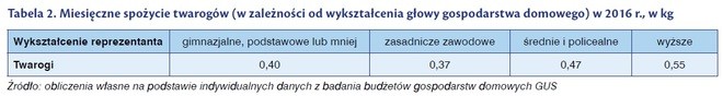 Rozpatrując spożycie twarogów według poziomu wykształcenia głowy domu, to z pewnymi wyjątkami wzrasta ono wraz ze wzrostem poziomu wykształcenia. Najniższy poziom spożycia twarogów obserwuje się w gospodarstwach osób z wykształceniem zasadniczym zawodowym – 0,37 kg na osobę oraz gimnazjalnym i niższym – 0,40 kg na osobę, natomiast najwyższe w gospodarstwach osób legitymujących się wykształceniem wyższym – 0,55 kg na osobę.