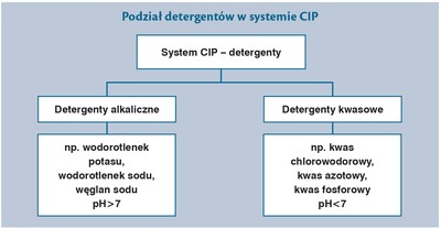 W systemie Cleaning In Place stosowane są dwa rodzaje detergentów: kwasowe i alkaliczne. Powszechnie stosowanymi alkalicznymi (zasadowymi) detergentami do czyszczenia instalacji są na przykład: wodorotlenek sodu, wodorotlenek potasu, węglan sodu. Zasadowe środki czyszczące, zwane alkaliami to te, których pH jest wyższe niż 7. Z kolei najczęściej stosowanymi środkami kwasowymi o pH mniejszym od 7 są na przykład: kwas chlorowodorowy, kwas azotowy, kwas fosforowy, kwas cytrynowy itp. Zasadowe środki myjące są powszechnie stosowane w przemyśle, gdyż znakomicie nadają się do zmydlania tłuszczu, przekształcają tłuszcz w mydło, a taka postać jest już łatwo usuwana z wodą. Gorące alkalia świetnie sprawdzają się do usuwania kamieni mlecznych w rurociągach. Dodatek środków nawilżających ułatwia zaś pozbycie się białka, rozkładając je na części rozpuszczalne w wodzie. Według danych literaturowych stosuje się do 0,5-2% roztwór sody kaustycznej przy temperaturze do 85°C. Jeśli mamy do czynienia z silnie zabrudzonymi powierzchniami, wtedy można zwiększyć stężenie sody kaustycznej do 4%. Warto dodać, że soda kaustyczna to bardzo silna zasada o stosunkowo niskiej cenie. Doskonale sprawdza się przy usuwaniu na przykład tłuszczów. Najbardziej agresywnym alkalicznym detergentem jest wodorotlenek sodu. Zazwyczaj stosuje się go w stężeniach od 0,15% do 1%, przy temperaturze w zakresie od 70 do 80°C, w przedziale czasowym 10-30 minut. W przypadku gdy mamy do czynienia z silnie zabrudzonymi powierzchniami, jakie występują na przykład w płytowych i rurowych wymiennikach ciepła, na których osadziło się spalone białko, stosowane stężenia wodorotlenku sodu sięgają 5%.