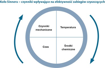 W przypadku temperatury – energii cieplnej – energia ta jest dostarczana do układu wraz z gorącymi roztworami środków myjących. Podwyższona temperatura skutkuje łatwiejszym rozpuszczaniem osadów, ponadto katalizuje reakcje pomiędzy reagentami, zmniejsza napięcie powierzchniowe. Środki chemiczne powodują rozpuszczenie, zmydlenie lub peptyzację zanieczyszczeń. Czas mycia należy skrócić do minimum, ze względów ekonomicznych. Powinien być natomiast tak zoptymalizowany, aby uzyskać czystą powierzchnię mycia. Najistotniejszym sektorem w kole Sinnera są czynniki mechaniczne. Mowa o siłach ścinających i burzliwym, turbulentnym przepływie w systemie CIP. Ogromny wpływ na warunki w jakich dochodzi do usuwania osadów z wnętrza urządzeń ma prędkość przepływu medium oraz zwilżenie powierzchni, które wchodzą w kontakt z produktem. Osiągany wtedy mechaniczny efekt mycia, potęguje odrywanie się cząsteczek brudu od powierzchni oczyszczanej, które ulegają rozproszeniu w całej objętości płynu, przetransportowaniu i usunięciu.