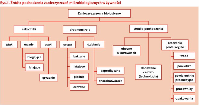 Zanieczyszczenia biologiczne to takie, które są samodzielnymi, żywymi organizmami, a ich cechą charakterystyczną jest to, że ich ilość może zwiększać się w czasie. Na rys. pokazano różne organizmy mogące zanieczyszczać żywność oraz źródła ich pochodzenia.