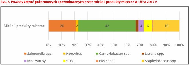 Kategoria mleko i produkty mleczne spowodowała w sumie 49 ognisk zatruć pokarmowych, co stanowi 7,7% wszystkich zatruć. Wewnątrz tej kategorii szczegółowo zatrucia spowodowały: sery (14 ognisk – 2,2% wszystkich zatruć), mleko – 26 ognisk, 4,1% wszystkich zatruć, a pozostałe produkty mleczne 9 ognisk, co stanowi 1,4% wszystkich zatruć. Szczegółowo czynniki, które wywołały zatrucia pokarmowe pokazano na rys. 3.