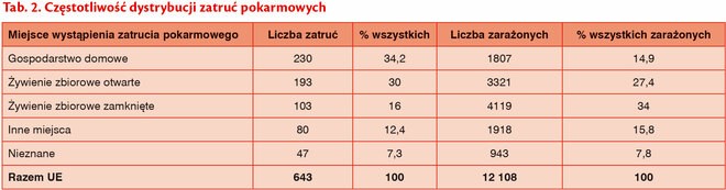Dwadzieścia trzy kraje członkowskie zgłosiły ogółem 643 epidemie przenoszone przez żywność i wodę, co stanowiło 12,7% wszystkich ognisk chorobotwórczych. Największą liczbę epidemii chorób od żywnościowych potwierdzono w Polsce, Hiszpanii, Francji i łącznie stanowiły one ponad połowę (57,9%) epidemii dobrze udokumentowanych co do miejsca wystąpienia, czynnika chorobotwórczego oraz żywności przenoszącej zagrożenie. Żywność powodująca zatrucia pokarmowe w 60% (59,6%, 381 z 639) to była żywność pochodzenia zwierzęcego, należąca do takich grup produktów spożywczych jak: mięso i produkty mięsne (121 zatruć, 18,9% wszystkich), jajka i produkty jajeczne (105 zatruć, 16,4% wszystkich), ryby i produkty rybołówstwa (106 zatruć, 16,6% wszystkich) oraz mleko i produkty mleczne. Kategoria produktów mieszane posiłki, posiłki wydawane w formie bufetu oraz inne posiłki spowodowała zatrucia pokarmowe w prawie co czwartym przypadku. W porównaniu z poprzednimi latami nie zaobserwowano żadnych istotnych zmian w tej statystyce.