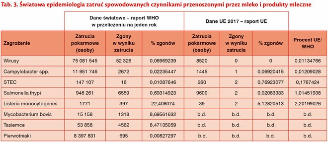Na koniec kilka danych odnośnie do światowych zatruć czynnikami stwierdzanymi w mleku i produktach mlecznych. Dane te zestawiono w tab. 3. Wyraźnie widać, że ogólnoświatowa śmiertelność jest wyższa niż europejska.