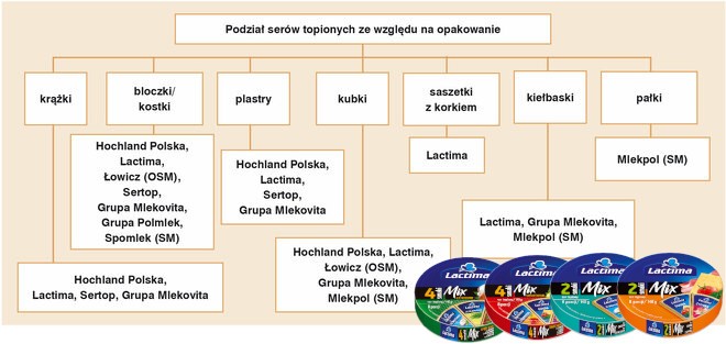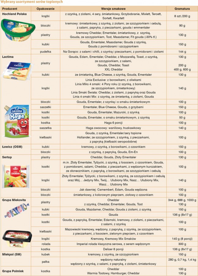 Konsumencki rynek serów topionych jest już podzielony, a większe zmiany obserwuje się raczej w segmencie zakupów instytucjonalnych i HoReCa. Sery topione są wytwarzane przez kilku czołowych graczy na rynku mleczarskim. Największym producentem serów topionych w Polsce jest firma Hochland Polska, dalej Lactima oraz Sertop. Sery topione znajdują się także w portfolio Grupy Mlekovita, mleczarni Mlekpol (SM), Grupy Polmlek, lecz asortyment ten nie jest dla tych firm kluczowy jak ma to miejsce w przypadku pierwszej trójki.