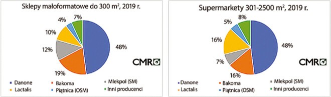 Za prawie połowę sprzedaży wartościowej jogurtów pitnych w obu kanałach dystrybucji odpowiada jeden producent – firma Danone, z markami Activia, Ale Pitny, Gratka. Pozostali liczący się gracze rynkowi to Bakoma, Mlekpol SM, Lactalis, Piątnica OSM. Warto odnotować niski udział wartościowy sprzedaży jogurtów pitnych pod markami własnymi (private label) w mniejszych sklepach (poniżej 1%) i umiarkowany patrząc przez pryzmat innych kategorii mlecznych w supermarketach (ok 5%).
