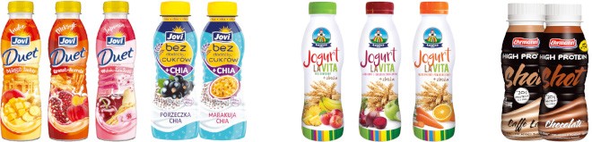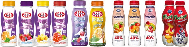 - Jogurt Polski (w butelkach 250 g): klasyczny w smakach: truskawkowy, pomarańcza z melisą, owoce leśne oraz bez laktozy w tych samych smakach i dodatkowo waniliowym.