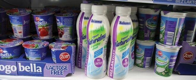 Grupa Mlekovita, w ofercie jogurtów bez laktozy proponuje Jogurt Polski bez laktozy o smaku truskawka lub gruszka, w kubkach 310 g, Jogurt Polski pitny bez laktozy w butelkach 250 g, w kilku wariantach smakowych tj. waniliowy, truskawkowy, owoce leśne, pomarańcza-melisa oraz Polski Jogurt naturalny bez laktozy, w kubkach 350 g. W portfolio firmy Bakoma znajduje się natomiast Jogurt naturalny bez laktozy (2% tłuszczu) w butelkach 400 g.