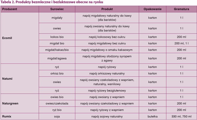 Na rynku można znaleźć wiele produktów alternatywnych dla mleczarskich, które są odpowiedzią na potrzeby konsumentów w kontekście nietolerancji laktozy. Są to różnego typu napoje bezlaktozowe i ekwiwalenty produktów mleczarskich tj. śmietana lub desery. Najpopularniejszymi surowcami używanymi są soja, migdały, owies, orkisz albo różnego typu orzechy bądź kokosy. Produkty te mają smak naturalny lub z dodatek wanilii albo czekolady. Bardzo często są wzbogacane w witaminy i wapń. Można je stosować bezpośrednio do konsumpcji lub jako dodatek do różnych celów kulinarnych.