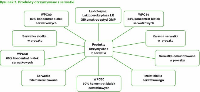 Serwatka przez wiele lat kojarzona była z uciążliwym produktem ubocznym przemysłu spożywczego. Jedną z głównych przyczyn takiego stanu rzeczy były i są nadal ogromne ilości serwatki, które powstają wraz z produkcją sera w zakładach przemysłu mleczarskiego. Średnio na produkcję 1 kg sera przypada około 8-9 litrów powstającej serwatki. Wyróżniamy dwa rodzaje serwatki: podpuszczkową i kwasową. Jak nietrudno się domyślić, serwatka kwasowa jest kwaśna, podpuszczkowa zaś słodka. Z punktu widzenia prostoty przerobu, serwatka podpuszczkowa wydaje się być mniej kłopotliwa. W przypadku serwatki kwasowej problematyczna staje się zawartość wapnia i kwasu mlekowego, nie jest wykluczony przerób serwatki na WPC, aczkolwiek wymaga to większych nakładów pracy – pojawiają się problemy przy suszeniu WPC i permeatu serwatki oraz reakcje brązowienia. Serwatka szybko ulega zepsuciu. Przetwórstwo serwatki skupia się wokół trzech głównych metod radzenia sobie z tym uciążliwym produktem ubocznym. Serwatkę zagęszcza się, poddaje się frakcjonowaniu bądź modyfikacjom. Każda z tych dróg prowadzi do innych rezultatów. I tak, w przypadku zagęszczania powstaje serwatka zagęszczona, która dalej można wysuszyć, uzyskując na przykład produkt WPC bądź WPI. Z serwatki poddanej frakcjonowaniu wyodrębnione zostają trzy grupy: białka, laktoza oraz minerały. Serwatka poddawana modyfikacjom polega na dwóch metodach: chemicznej oraz na hydrolizie. Serwatka może zostać przekształcona w proszek serwatkowy, demineralizowaną serwatkę 25, 50 i 90%, serwatkę o zredukowanej zawartości laktozy, koncentraty białek serwatkowych WPC od 34 do 80%, izolaty białek serwatkowych, hydrolizaty laktozy, produkty modyfikacji białek, laktozę farmaceutyczną oraz spożywczą, minerały czy frakcje białek: laktoferynę, laktoperoksydazę.