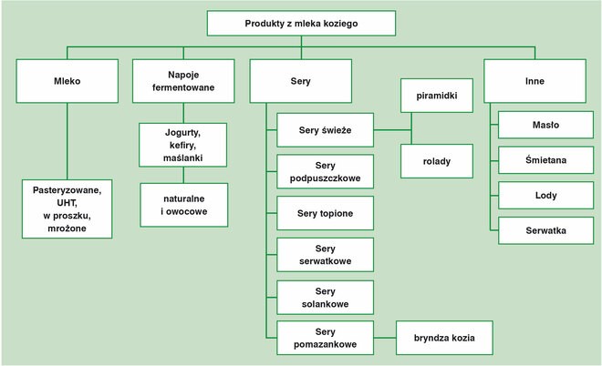 Z mleka koziego produkowane są najczęściej sery świeże lub twarde oraz różnego typu produkty fermentowane. Niestety wydajność produkcji sera koziego jest niższa niż krowiego, bowiem na wyprodukowanie 1 kg sera koziego potrzebne jest 10-12 l mleka. Skład sera koziego to 30% suchej masy, w serach świeżych do 70%, w serach długodojrzewających od 6 do 43% tłuszczu, od 5 do 30% białka, od 0,1 do 3% laktozy oraz od 1 do 5% składników mineralnych.