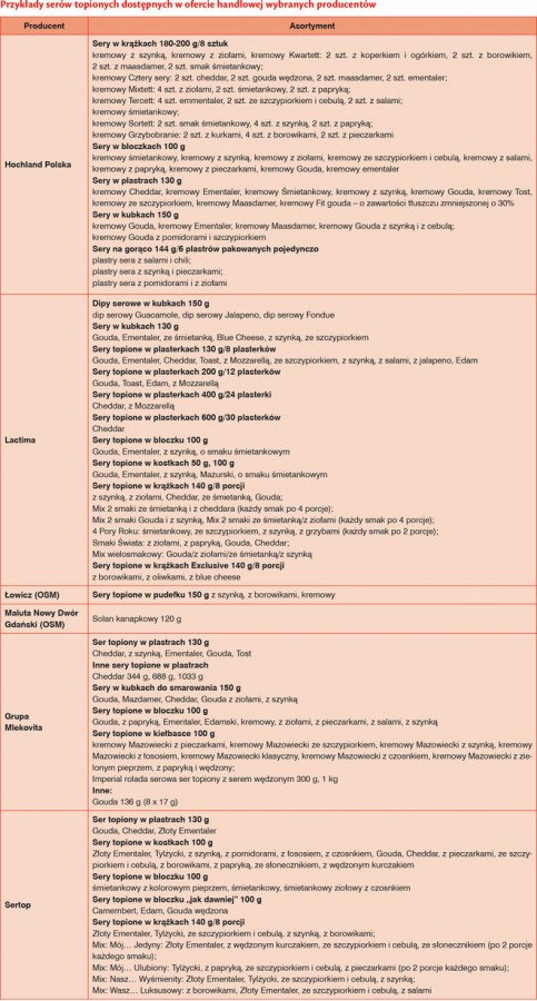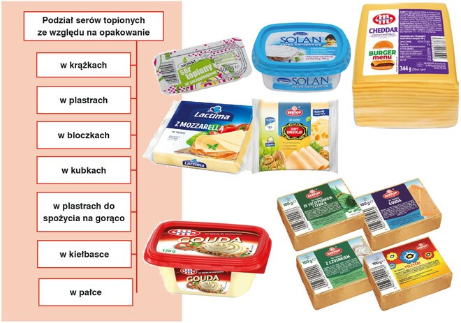 Producenci zachęcają do sięgnięcia po ser topiony. Oferują go w wielu atrakcyjnych wariantach opakowania spośród których każdy znajdzie coś dla siebie. Sery w krążkach (ułożone w wielosmakowe pyszne trójkąciki) uwielbiają szczególnie mali smakosze. Ser topiony w plastrach „na zimno” lub „na gorąco”, to łatwy i szybki sposób na przygotowanie kanapki albo chrupiącego, ciepłego tosta. Ser topiony w bloczkach to więcej ulubionego smaku w jednym opakowaniu. Z kolei ser topiony w praktycznych kubeczkach z wieczkiem umożliwia zachowanie świeżości serka i łatwy dostęp do produktu. Nazwy serów pochodzą od serów z których zostały wytworzone, a w ich składzie musi być co najmniej 75% masy sera podstawowego, od którego produkt nosi nazwę.